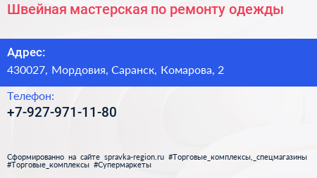 Швейная мастерская по ремонту одежды по адресу 430027, Мордовия, Саранск, Комарова, 2 в дальнейшем Организация, размещена в следующих категориях: