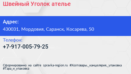 Швейный Уголок, ателье по адресу 430031, Мордовия, Саранск, Косарева, 50 в дальнейшем Организация, размещена в следующих категориях: