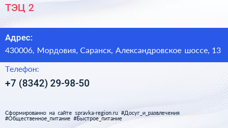 ТЭЦ-2 по адресу 430006, Мордовия, Саранск, Александровское шоссе, 13 в дальнейшем Организация, размещена в следующих категориях: