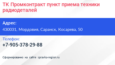 ТК Промконтракт, пункт приема техники, радиодеталей по адресу 430031, Мордовия, Саранск, Косарева, 50 в дальнейшем Организация, размещена в следующих категориях:
