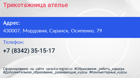Трикотажница, ателье по адресу 430007, Мордовия, Саранск, Осипенко, 79 в дальнейшем Организация, размещена в следующих категориях: