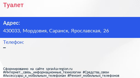 Туалет по адресу 430033, Мордовия, Саранск, Ярославская, 26 в дальнейшем Организация, размещена в следующих категориях: