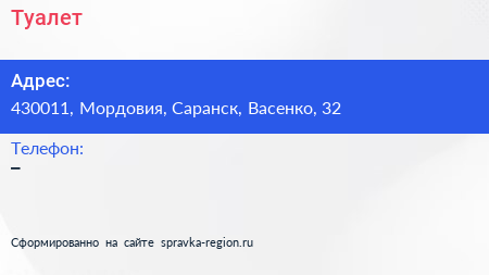 Туалет по адресу 430011, Мордовия, Саранск, Васенко, 32 в дальнейшем Организация, размещена в следующих категориях:
