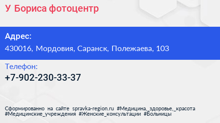 У Бориса, фотоцентр по адресу 430016, Мордовия, Саранск, Полежаева, 103 в дальнейшем Организация, размещена в следующих категориях: