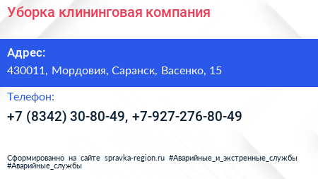 Уборка, клининговая компания по адресу 430011, Мордовия, Саранск, Васенко, 15 в дальнейшем Организация, размещена в следующих категориях: