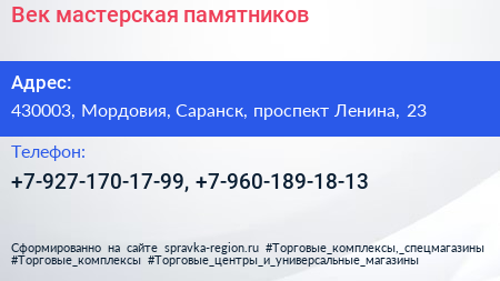 Век, мастерская памятников по адресу 430003, Мордовия, Саранск, проспект Ленина, 23 в дальнейшем Организация, размещена в следующих категориях: