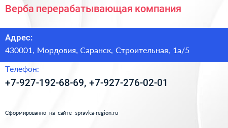 Верба, перерабатывающая компания по адресу 430001, Мордовия, Саранск, Строительная, 1а/5 в дальнейшем Организация, размещена в следующих категориях: