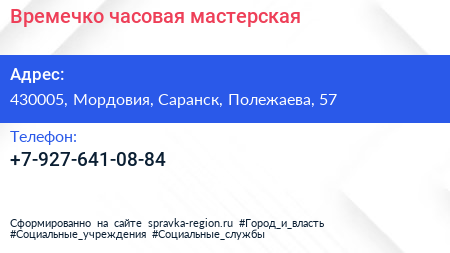 Времечко, часовая мастерская по адресу 430005, Мордовия, Саранск, Полежаева, 57 в дальнейшем Организация, размещена в следующих категориях: