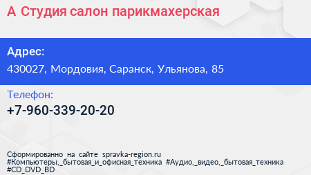 А Студия, салон-парикмахерская по адресу 430027, Мордовия, Саранск, Ульянова, 85 в дальнейшем Организация, размещена в следующих категориях: