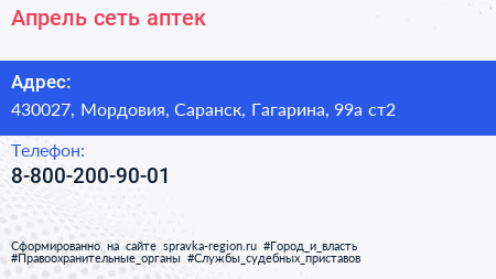 Апрель, сеть аптек по адресу 430027, Мордовия, Саранск, Гагарина, 99а ст2 в дальнейшем Организация, размещена в следующих категориях: