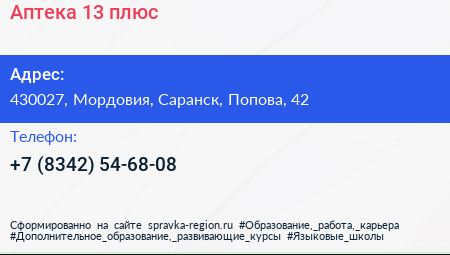 Аптека 13 плюс по адресу 430027, Мордовия, Саранск, Попова, 42 в дальнейшем Организация, размещена в следующих категориях: