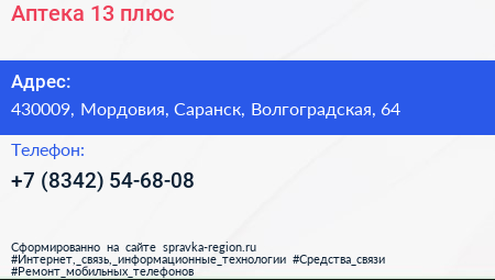 Аптека 13 плюс по адресу 430009, Мордовия, Саранск, Волгоградская, 64 в дальнейшем Организация, размещена в следующих категориях: