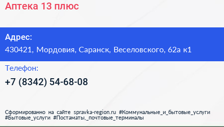 Аптека 13 плюс по адресу 430421, Мордовия, Саранск, Веселовского, 62а к1 в дальнейшем Организация, размещена в следующих категориях: