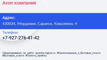 Avon, компания по адресу 430034, Мордовия, Саранск, Коваленко, 4 в дальнейшем Организация, размещена в следующих категориях: