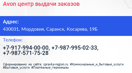 Avon, центр выдачи заказов по адресу 430031, Мордовия, Саранск, Косарева, 19Б в дальнейшем Организация, размещена в следующих категориях: