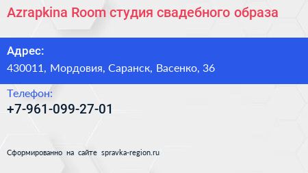Azrapkina Room, студия свадебного образа по адресу 430011, Мордовия, Саранск, Васенко, 36 в дальнейшем Организация, размещена в следующих категориях: