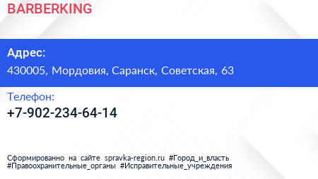 BARBERKING по адресу 430005, Мордовия, Саранск, Советская, 63 в дальнейшем Организация, размещена в следующих категориях: