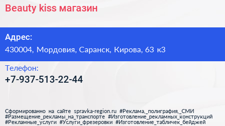 Beauty kiss, магазин по адресу 430004, Мордовия, Саранск, Кирова, 63 к3 в дальнейшем Организация, размещена в следующих категориях: