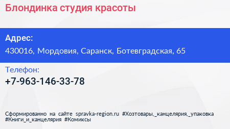 Блондинка, студия красоты по адресу 430016, Мордовия, Саранск, Ботевградская, 65 в дальнейшем Организация, размещена в следующих категориях: