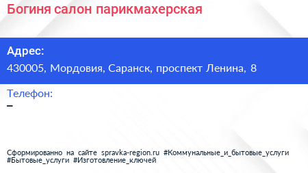 Богиня, салон-парикмахерская по адресу 430005, Мордовия, Саранск, проспект Ленина, 8 в дальнейшем Организация, размещена в следующих категориях:
