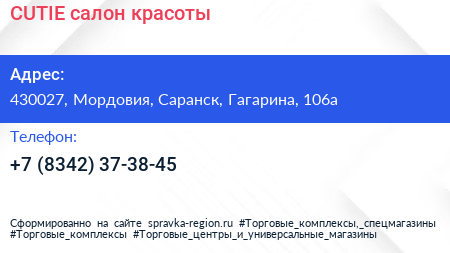 CUTIE, салон красоты по адресу 430027, Мордовия, Саранск, Гагарина, 106а в дальнейшем Организация, размещена в следующих категориях: