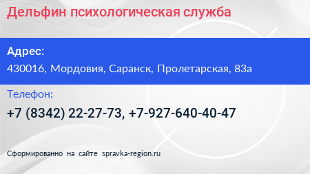 Дельфин, психологическая служба по адресу 430016, Мордовия, Саранск, Пролетарская, 83а в дальнейшем Организация, размещена в следующих категориях: