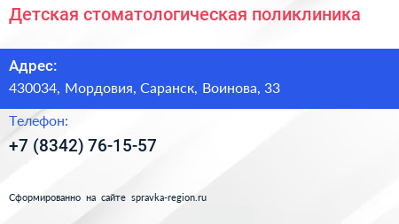 Детская стоматологическая поликлиника по адресу 430034, Мордовия, Саранск, Воинова, 33 в дальнейшем Организация, размещена в следующих категориях: