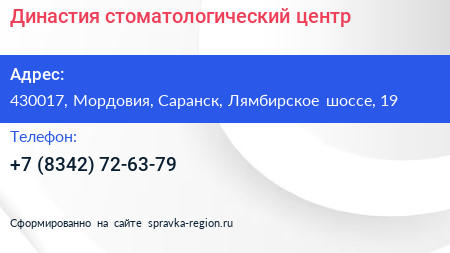 Династия, стоматологический центр по адресу 430017, Мордовия, Саранск, Лямбирское шоссе, 19 в дальнейшем Организация, размещена в следующих категориях:
