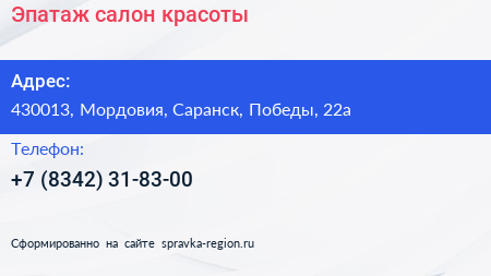 Эпатаж, салон красоты по адресу 430013, Мордовия, Саранск, Победы, 22а в дальнейшем Организация, размещена в следующих категориях: