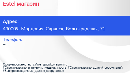 Estel, магазин по адресу 430009, Мордовия, Саранск, Волгоградская, 71 в дальнейшем Организация, размещена в следующих категориях: