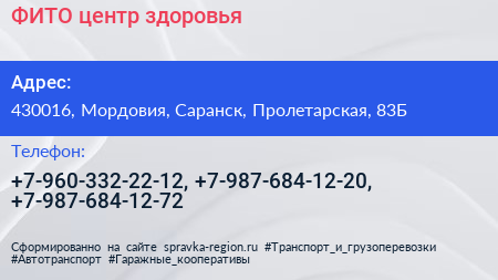 ФИТО, центр здоровья по адресу 430016, Мордовия, Саранск, Пролетарская, 83Б в дальнейшем Организация, размещена в следующих категориях: