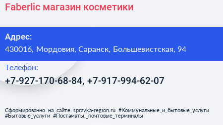 Faberlic, магазин косметики по адресу 430016, Мордовия, Саранск, Большевистская, 94 в дальнейшем Организация, размещена в следующих категориях: