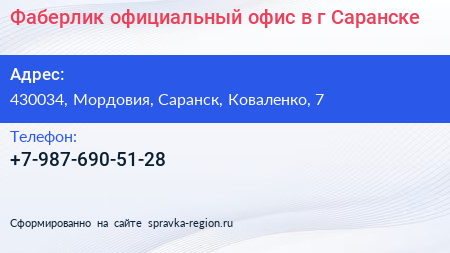 Фаберлик, официальный офис в г. Саранске по адресу 430034, Мордовия, Саранск, Коваленко, 7 в дальнейшем Организация, размещена в следующих категориях: