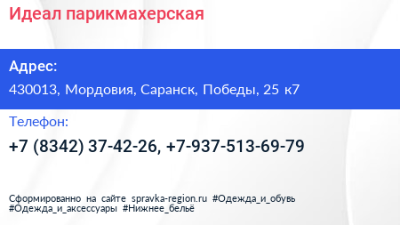 Идеал, парикмахерская по адресу 430013, Мордовия, Саранск, Победы, 25 к7 в дальнейшем Организация, размещена в следующих категориях:
