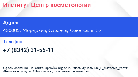 Институт Центр косметологии по адресу 430005, Мордовия, Саранск, Советская, 57 в дальнейшем Организация, размещена в следующих категориях: