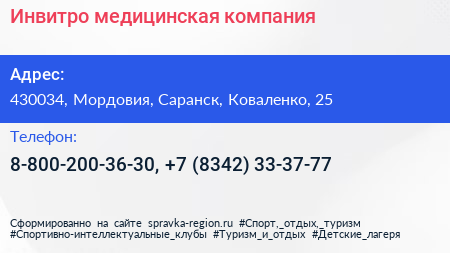 Инвитро, медицинская компания по адресу 430034, Мордовия, Саранск, Коваленко, 25 в дальнейшем Организация, размещена в следующих категориях: