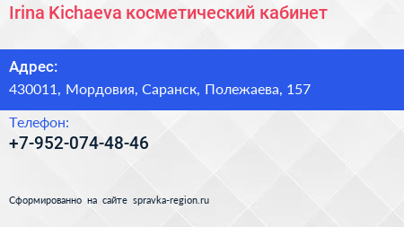 Irina Kichaeva, косметический кабинет по адресу 430011, Мордовия, Саранск, Полежаева, 157 в дальнейшем Организация, размещена в следующих категориях:
