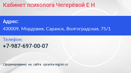 Кабинет психолога Чегерёвой Е.Н. по адресу 430009, Мордовия, Саранск, Волгоградская, 75/1 в дальнейшем Организация, размещена в следующих категориях: