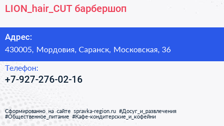 LION_hair_CUT, барбершоп по адресу 430005, Мордовия, Саранск, Московская, 36 в дальнейшем Организация, размещена в следующих категориях: