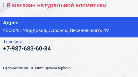 LR, магазин натуральной косметики по адресу 430028, Мордовия, Саранск, Веселовского, 49 в дальнейшем Организация, размещена в следующих категориях: