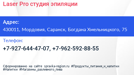 Laser Pro, студия эпиляции по адресу 430011, Мордовия, Саранск, Богдана Хмельницкого, 75 в дальнейшем Организация, размещена в следующих категориях: