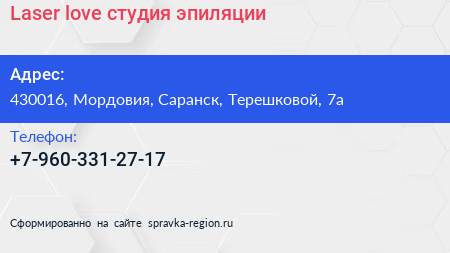 Laser love, студия эпиляции по адресу 430016, Мордовия, Саранск, Терешковой, 7а в дальнейшем Организация, размещена в следующих категориях: