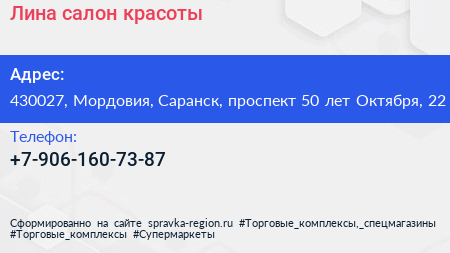 Лина, салон красоты по адресу 430027, Мордовия, Саранск, проспект 50 лет Октября, 22 в дальнейшем Организация, размещена в следующих категориях: