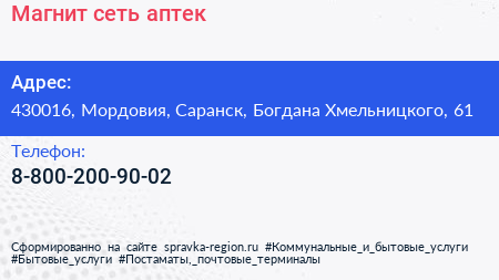 Магнит, сеть аптек по адресу 430016, Мордовия, Саранск, Богдана Хмельницкого, 61 в дальнейшем Организация, размещена в следующих категориях: