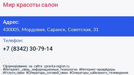 Мир красоты, салон по адресу 430005, Мордовия, Саранск, Советская, 31 в дальнейшем Организация, размещена в следующих категориях: