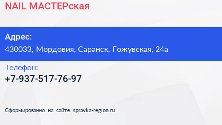 NAIL-МАСТЕРская по адресу 430033, Мордовия, Саранск, Гожувская, 24а в дальнейшем Организация, размещена в следующих категориях: