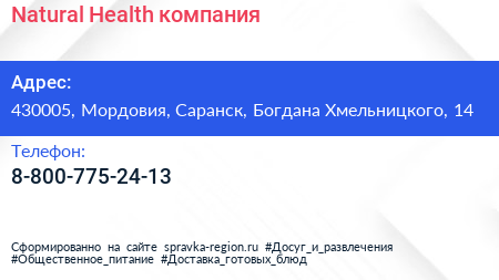 Natural Health, компания по адресу 430005, Мордовия, Саранск, Богдана Хмельницкого, 14 в дальнейшем Организация, размещена в следующих категориях: