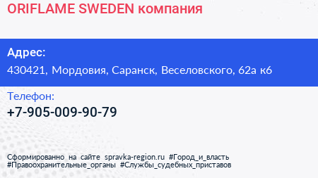 ORIFLAME SWEDEN, компания по адресу 430421, Мордовия, Саранск, Веселовского, 62а к6 в дальнейшем Организация, размещена в следующих категориях: