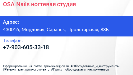OSA Nails, ногтевая студия по адресу 430016, Мордовия, Саранск, Пролетарская, 83Б в дальнейшем Организация, размещена в следующих категориях: