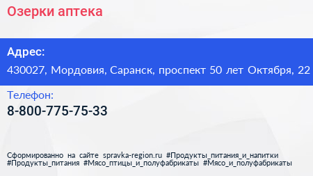 Озерки, аптека по адресу 430027, Мордовия, Саранск, проспект 50 лет Октября, 22 в дальнейшем Организация, размещена в следующих категориях: